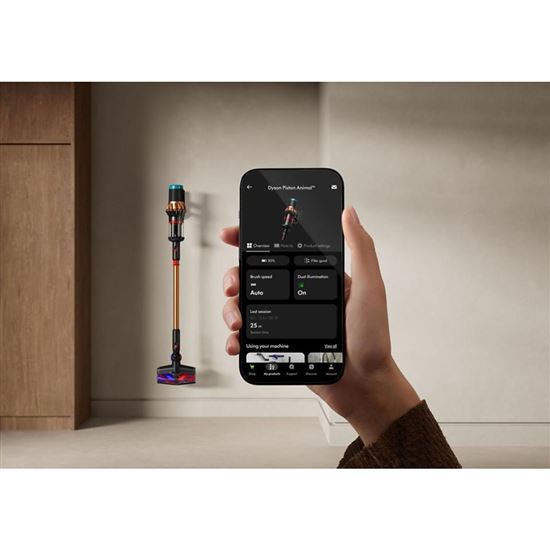 Stiahnite si aplikáciu MyDyson™ a buďte automaticky informovaní o nových aktualizáciách softvéru, vrátane tipov na údržbu a nastavenie osvetlenia. - Detekcia množstva prachu inteligentne zvyšuje sací výkon