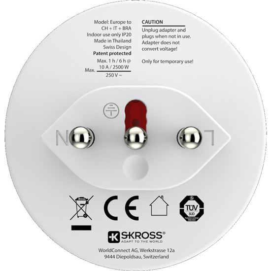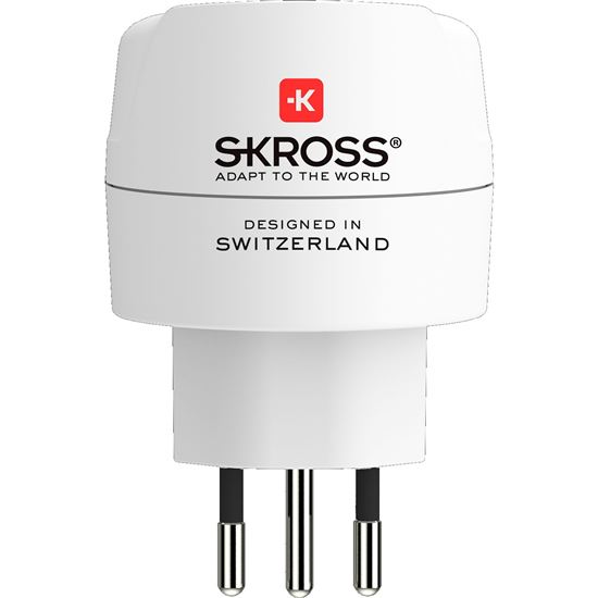Adaptér SKROSS Europe to Switzerland + Italy + Brazil umožňuje bezpečné pripojenie európskych zariadení v Brazílii, Taliansku, Švajčiarsku a ďalších 12 krajinách. Pripojí uzemnené aj neuzemnené vidlice prívodných káblov, bez problémov zapojíte všetko od notebookov, telefónov až po fény.
