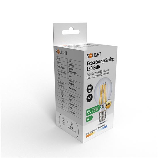 Extra úsporná LED žiarovka, ktorá spĺňa parametre pre najvyššiu energetickú triedu A, podľa novej legislatívy EÚ. Žiarovka je cca 2,5x úspornejšia ako štandardné LED žiarovky. Teplota svetla 2700K sa maximálne približuje klasickej žiarovke.- špeciálna LED filament technológia