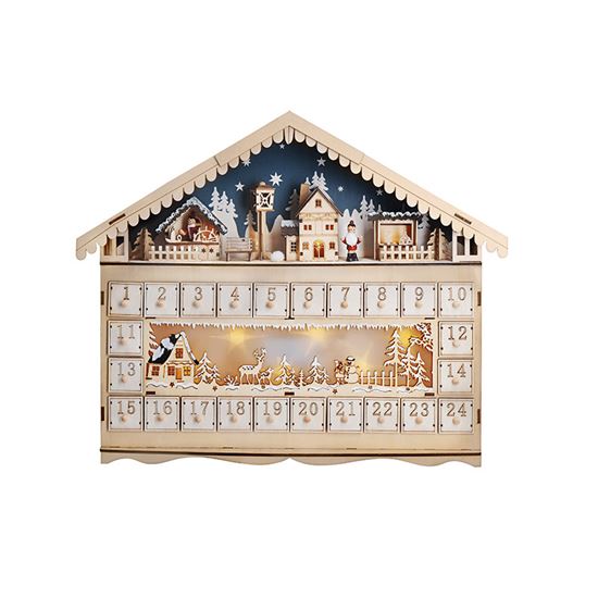 Štýlový adventný kalendár LED v tvare horskej chaty je nádherná dekorácia, ktorá vám spríjemní čakanie na Vianoce. S rozmermi 50 × 40 × 6 cm pôsobí veľmi dominantne a zároveň útulne. Je vyrobený z kvalitného dreva v prírodnej hnedej farbe a do domácnosti vnáša pocit tepla a tradičnej sviatočnej atmosféry. Kalendár je vybavený 10 teplými bielymi LED diódami, ktoré jemne osvetľujú jednotlivé prvky dekorácie a vytvárajú príjemné večerné osvetlenie.