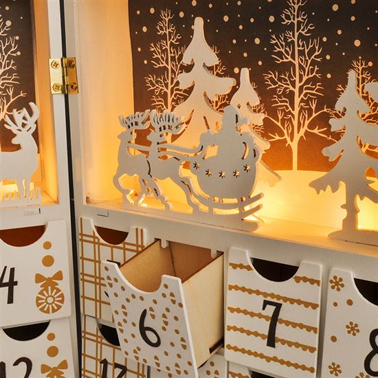 Drevený adventný kalendár LED je štýlovou kombináciou tradičného dizajnu a moderného osvetlenia. Kalendár s rozmermi 40 × 30 × 4,5 cm je zdobený zimnými a vianočnými motívmi a ukrýva 24 priehradiek na drobné darčeky alebo prekvapenia. Osem teplých bielych LED diód jemne osvetľuje výzdobu a vytvára príjemnú atmosféru každý decembrový večer.