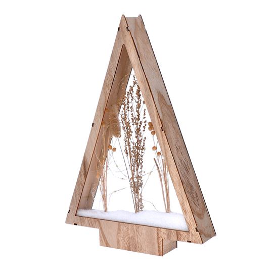 prírodná, vianočná drevená dekorácia v tvare vianočného stromčeka so zasneženými zimnými kvetmi, podsvietené tenkou LED retiazkou