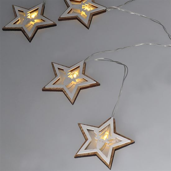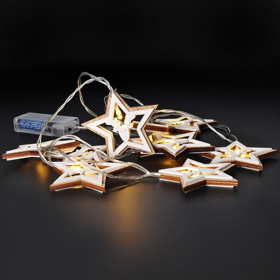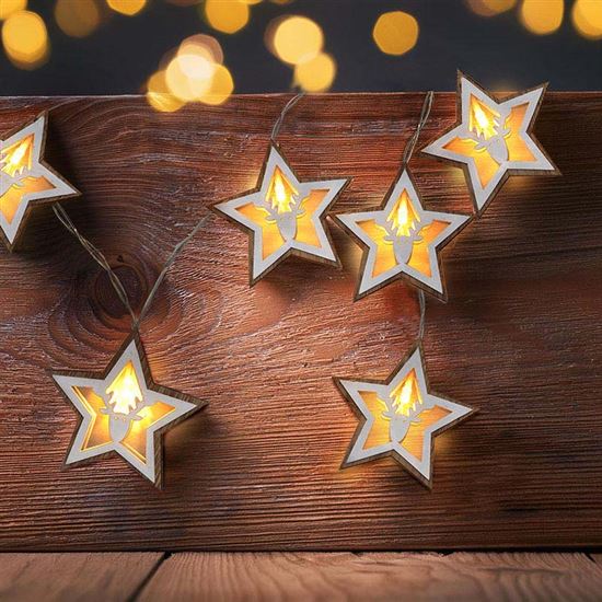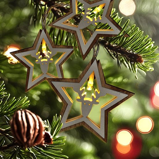Kúzelná vianočná reťaz s drevenými hviezdami dodá vášmu interiéru prírodnú a rustikálnu atmosféru. Na dĺžke 1,5 metra je rozmiestnených 10 LED diód, ktoré rozžiaria vyrezávané drevené hviezdy jemným teplým bielym svetlom. Jednoduchý dizajn v kombinácii so svetlom poskytuje jemnú, ale účinnú dekoráciu napríklad na parapete, stene alebo polici.