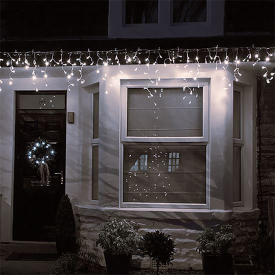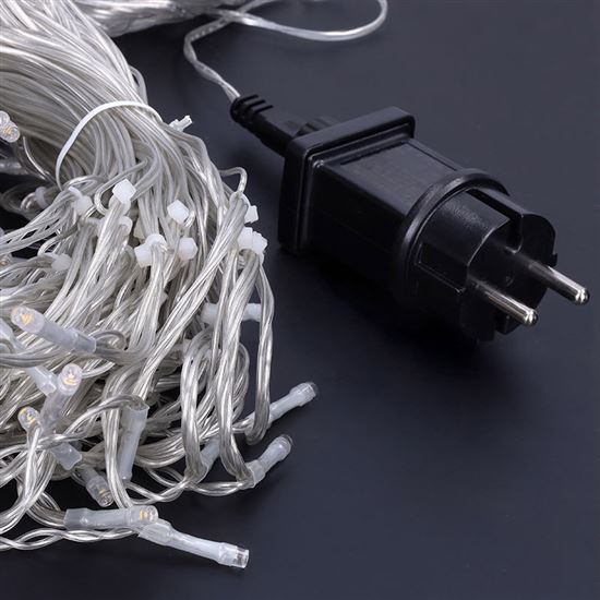 Oživte fasádu domu, balkón alebo pergolu svetelnou reťazou v tvare soplíka s celkovo 360 LED diódami v teplej bielej farbe. Usporiadanie svetiel v striedavých dĺžkach (24/56/32/48 cm) vytvára realistický efekt visiaceho ľadu. Svietiaca časť je dlhá 9 m, prívodný kábel meria 5 m a je ukončený priehľadným vodičom, ktorý neruší vzhľad dekorácie.