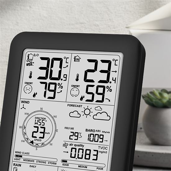 Táto profesionálna meteorologická stanica poskytuje úplný prehľad o počasí a kvalite ovzdušia s možnosťou pripojenia k aplikácii Smart Life / Tuya Smart, kde si môžete prezerať aktuálne hodnoty a prehľadné grafy meteorologických údajov. Ponúka automatické nastavenie času cez internet, kalendár až do roku 2099, zobrazenie dňa v týždni v 15 jazykoch, dva budíky s funkciou odloženého budenia (OFF alebo 5-60 min) a monitorovanie kvality ovzdušia pomocou snímača znečisťujúcich látok TVOC s 8 úrovňami koncentrácie (0-9 999 mg/m3). Meria vnútornú (-20 °C až 50 °C) a vonkajšiu teplotu (-40 °C až 70 °C), vlhkosť (20 % až 95 %), atmosférický tlak (600-1100 hPa), zrážky (0-9999 mm) a vietor (rýchlosť do 180 km/h, smer 0-359°) s 12 stupňami Beaufortovej stupnice. Sleduje intenzitu svetla (0-128 klux), UV index (0-15) a úroveň slnečného žiarenia. Má 4 úrovne podsvietenia displeja pre dokonalú čitateľnosť. Bezdrôtový snímač 433,92 MHz RF má dosah až 100 m na otvorenom priestranstve a umožňuje pripojenie až 3 ďalších snímačov vlhkosti a teploty. Meteostanica sa napája adaptérom DC 5V/1A alebo 2x batériami AA, meracia konzola 3x batériami AA, bezdrôtové snímače 2x batériami AA. Moderná technológia, široký rozsah meraní a možnosť pripojenia k aplikáciám z nej robia ideálnu voľbu pre každého, kto chce získať profesionálne údaje o počasí v reálnom čase.
