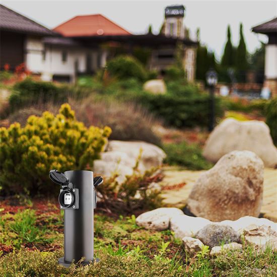 Dve zásuvky s detskými poistkami sú chránené samouzatvárateľnými krytkami, ktoré bránia vniknutiu vlhkosti a nečistôt. Vďaka krytiu IP44 je stĺpik vhodný aj na použitie za dažďa alebo vo vlhšom prostredí. Zásuvky zvládnu záťaž až 3680 W (16 A pri 230V~), čo je ideálne pre vonkajšie osvetlenie, záhradnú techniku aj bežné spotrebiče. Vhodný pre domy, pergoly aj firemné areály.