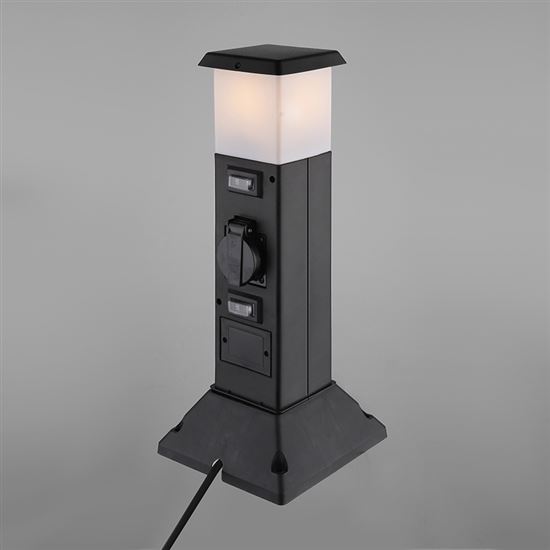Dve zásuvky s detskými poistkami a krytkami proti vlhkosti a prachu umožňujú bezpečné pripojenie záhradnej techniky, grilu alebo čerpadla. Každá zásuvka aj svetlo majú svoj vlastný vypínač pre pohodlné ovládanie. Matná čierna farba v kombinácii s čiernymi krytkami zásuviek pôsobí nenápadne a elegantne. Plastové telo s krytím IP44 je odolné voči vlhkosti aj prachu. Do svetla môžete vložiť štandardnú LED žiarovku s päticou E14. Ideálne riešenie pre štýlové a bezpečné vonkajšie napájanie.