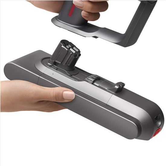 Vymeniteľný akumulátor pre Dyson Gen5. Pre dlhšie trvajúce upratovanie sa dá akumulátor ľahko vybrať a vymeniť za nabitý. Akumulátor je možno nabíjať v spotrebiči alebo mimo neho.