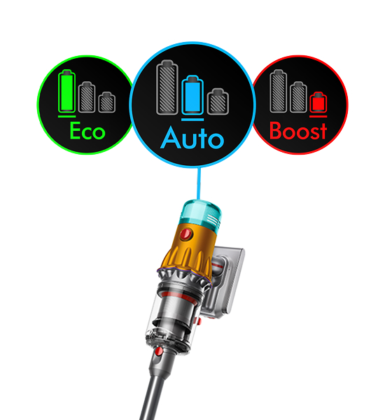 Režim Auto inteligentne prispôsobuje sací výkon s optimálnym vyvážením výkonu a doby chodu. Režim Eko poskytuje dlhší dobu chodu pre väčšie upratovanie, zatiaľ čo najvyšší režim Boost je navrhnutý pre krátke a intenzívne upratovanie. - Tlačidlový vypínač