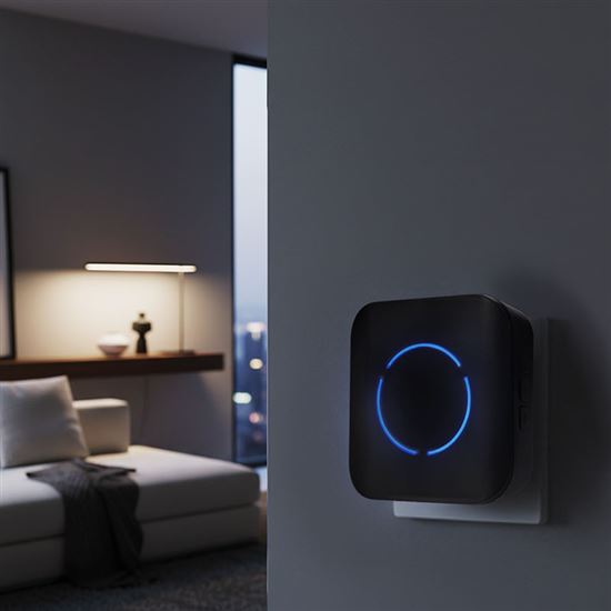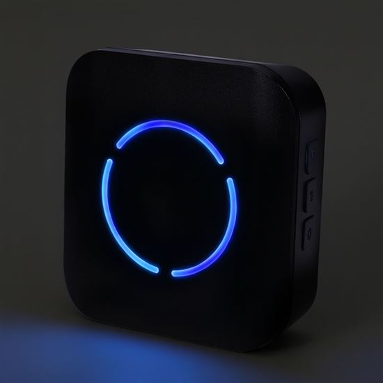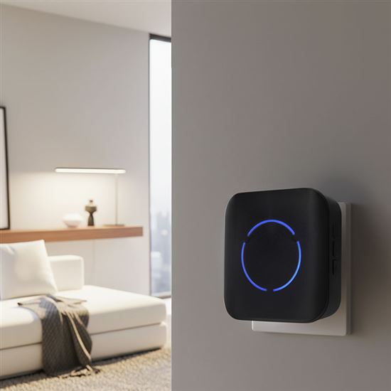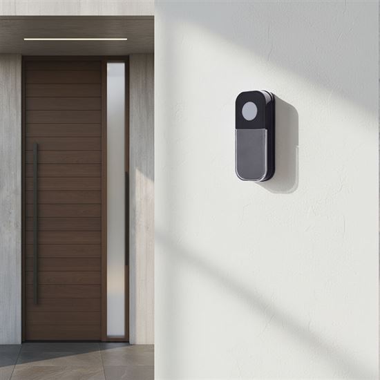 Bezdrôtový zvonček s kompaktnými rozmermi a zaobleným dizajnom sa hodí do každého moderného interiéru. Matná čierna povrchová úprava pôsobí nenápadne a zároveň štýlovo. Modré LED podsvietenie slúži ako decentná svetelná signalizácia zvonenia.