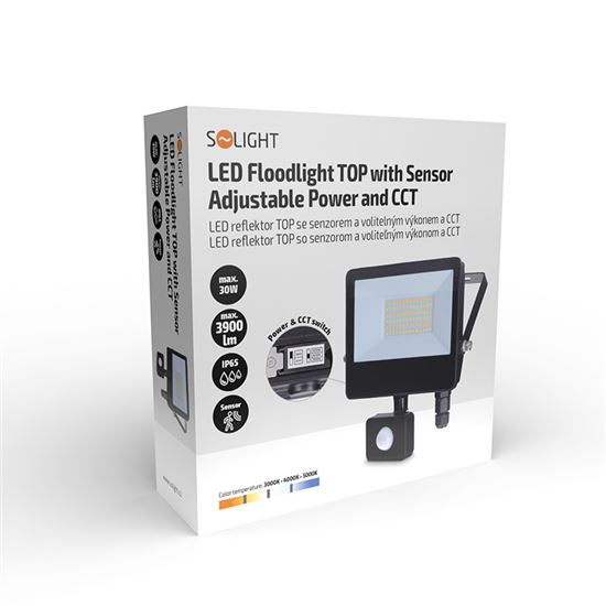 Výkonný LED reflektor radu TOP s integrovaným pohybovým senzorom prináša maximálne pohodlie a efektivitu pre vonkajšie osvetlenie. Užívateľ môže ľahko prepínať medzi dvoma úrovňami výkonu - 30W (3900lm) a 20W (2600lm), čo umožňuje prispôsobiť intenzitu svetla podľa konkrétnej situácie. Ďalej je možné nastaviť teplotu svetla na teplú, neutrálnu alebo studenú bielu (3000K/4000K/5000K), a to pomocou praktického prepínača na tele reflektora.