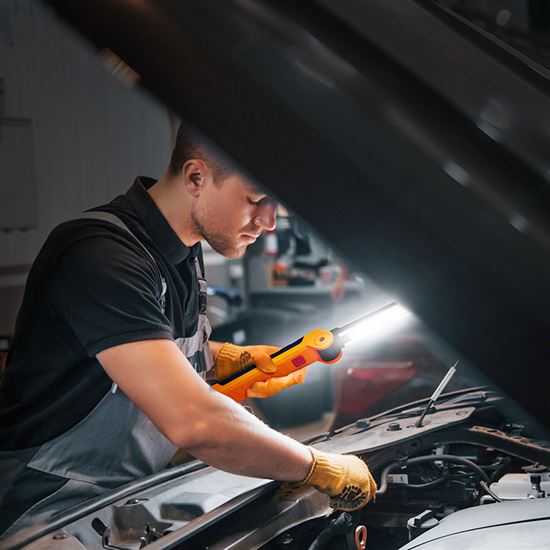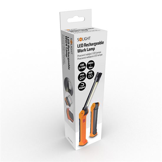 Kompaktná pracovná lampa s hlavným zdrojom COB LED (500 lm) a ďalšími 2× SMD LED (70 lm) ponúka 3 režimy osvetlenia: COB 100 %, COB 50 %, SMD 100 %. Vstavaná batéria (3,7 V / 1200 mAh) poskytuje až 10 hodín prevádzky a úplné nabitie trvá približne 4 hodiny.
