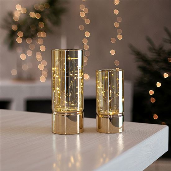 Sada obsahuje dve sklenené svetielka rôznych veľkostí, vybavené LED diódami – menšou s 10 diódami a väčšou s 20 diódami. Jemné svetlo krásne presvitá zlatým skleneným povrchom a vytvára pôsobivý efekt. Vďaka praktickému časovaču sa svetielka automaticky zapnú na 6 hodín a potom sa na 18 hodín vypnú, čo zaisťuje pohodlné a úsporné používanie.